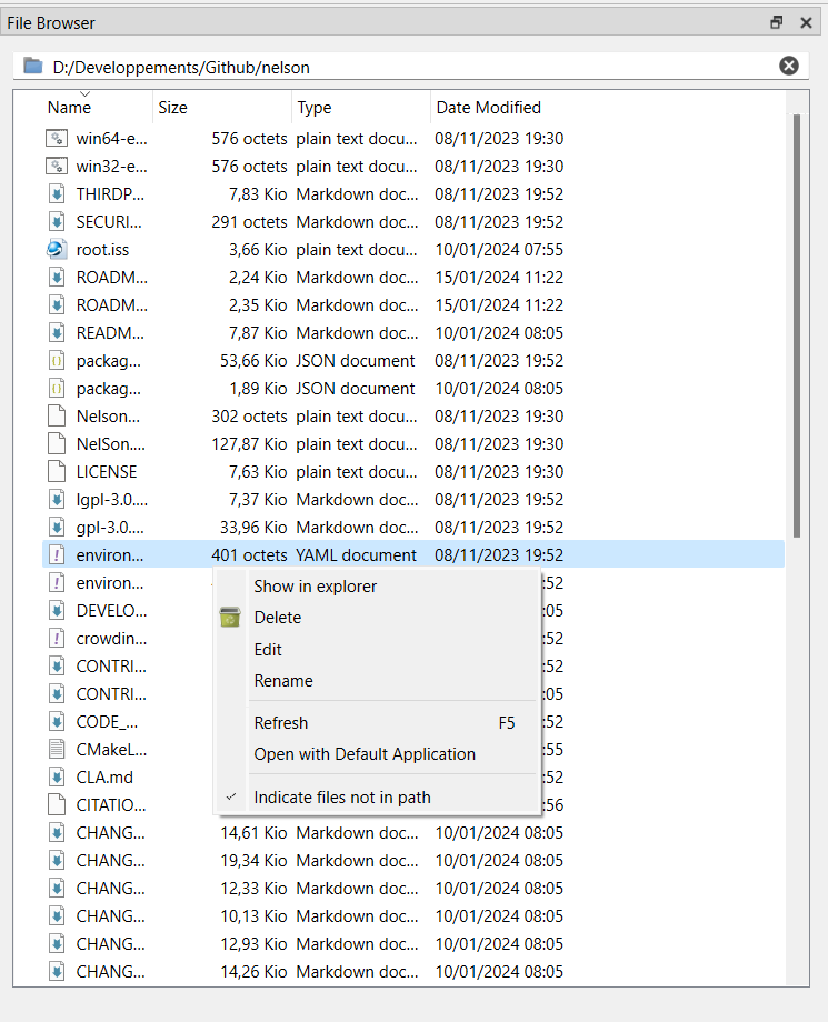 The Current Folder browser in Nelson facilitates interactive file and folder management. Utilize it to navigate, create, access, relocate, and rename files and folders within the current directory.